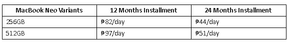 The MacBook Neo is available at Apple Authorized Resellers and Home Credit Philippines partner stores nationwide, including Abenson, Aerophone, Beyond the Box, Blue Box, Cell Boy, Digimap, Electroworld, Fone Style, Gadget Headz, Greentelcom, Inbox Stores PH, Laycom, Octagon, PC Express, Power Mac Center, Puerto Electronico, Silicon Valley, thinkingtools@mall, The Loop, Wiltelcom, and 8telcom.