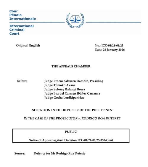 THE LEGAL battle surrounding the detention of former President Rodrigo Duterte reached a critical juncture on Jan. 28, as his defense team filed a formal appeal seeking his immediate interim release from International Criminal Court (ICC) custody.