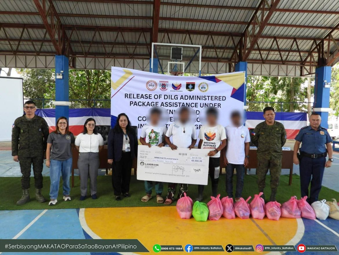 The assistance package, administered by the Department of the Interior and Local Government (DILG), was distributed by a panel of provincial leaders, including Rhona Pedraza-Abadilla, DILG-Bukidnon provincial director, Ellen T. Salumintao, provincial social welfare and development officer, and Lt. Col. Antonio G. Bulao I, 89th Infantry Battalion commander.