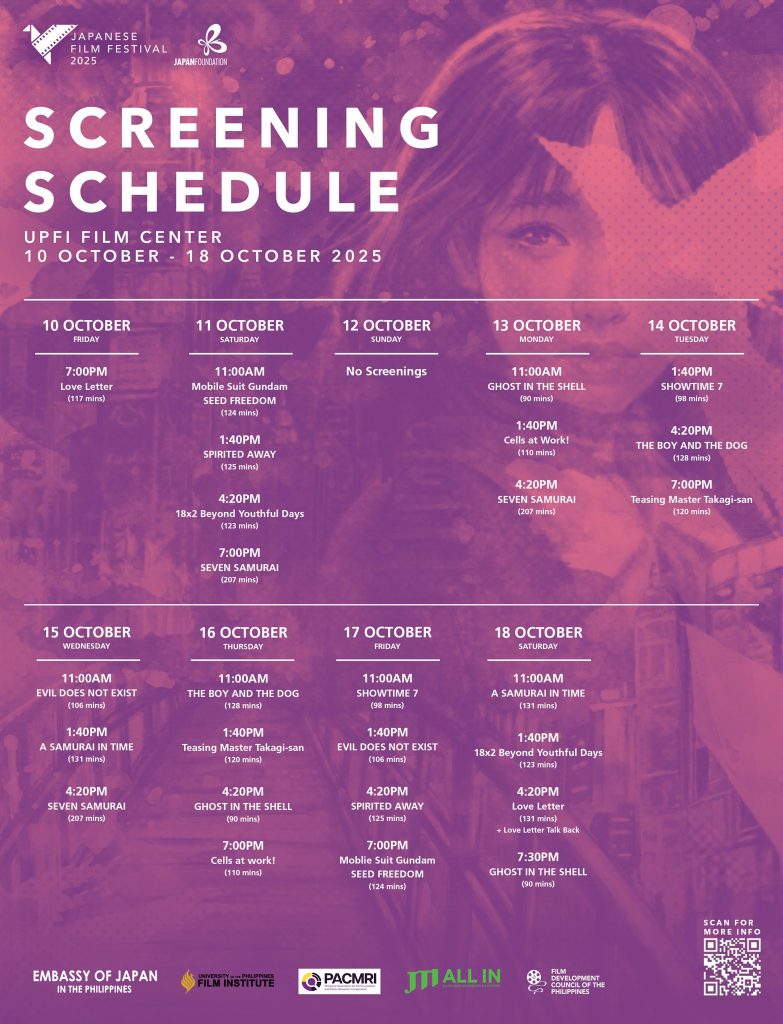 JFF 2025’s second run will officially kick off on Oct 10 at SM Lanang Cinema 3. The opening will premiere a 4K remastered version of the popular romance film “Love Letter” (1995) by Shunji Iwai that has screened in over 20 countries since its release.