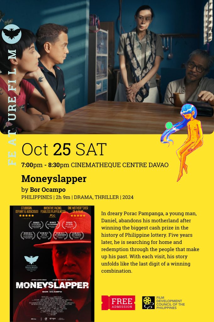 Moneyslapper (2024), directed by Bor Ocampo, comes to the festival on the first day in the evening. A movie of drama and thriller, the story follows a young man named Daniel (played by John Lloyd Cruz) who abandons his country after winning a large cash prize.