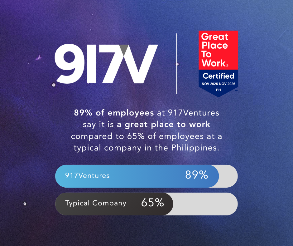 917Ventures has officially been recognized as a Great Place to Work® in the Philippines for 2025–2026, a distinction that comes directly from the voices of its employees. This certification highlights a thriving workplace culture built on trust, collaboration, and innovation, where every team member is empowered to grow, experiment, and make a meaningful impact.