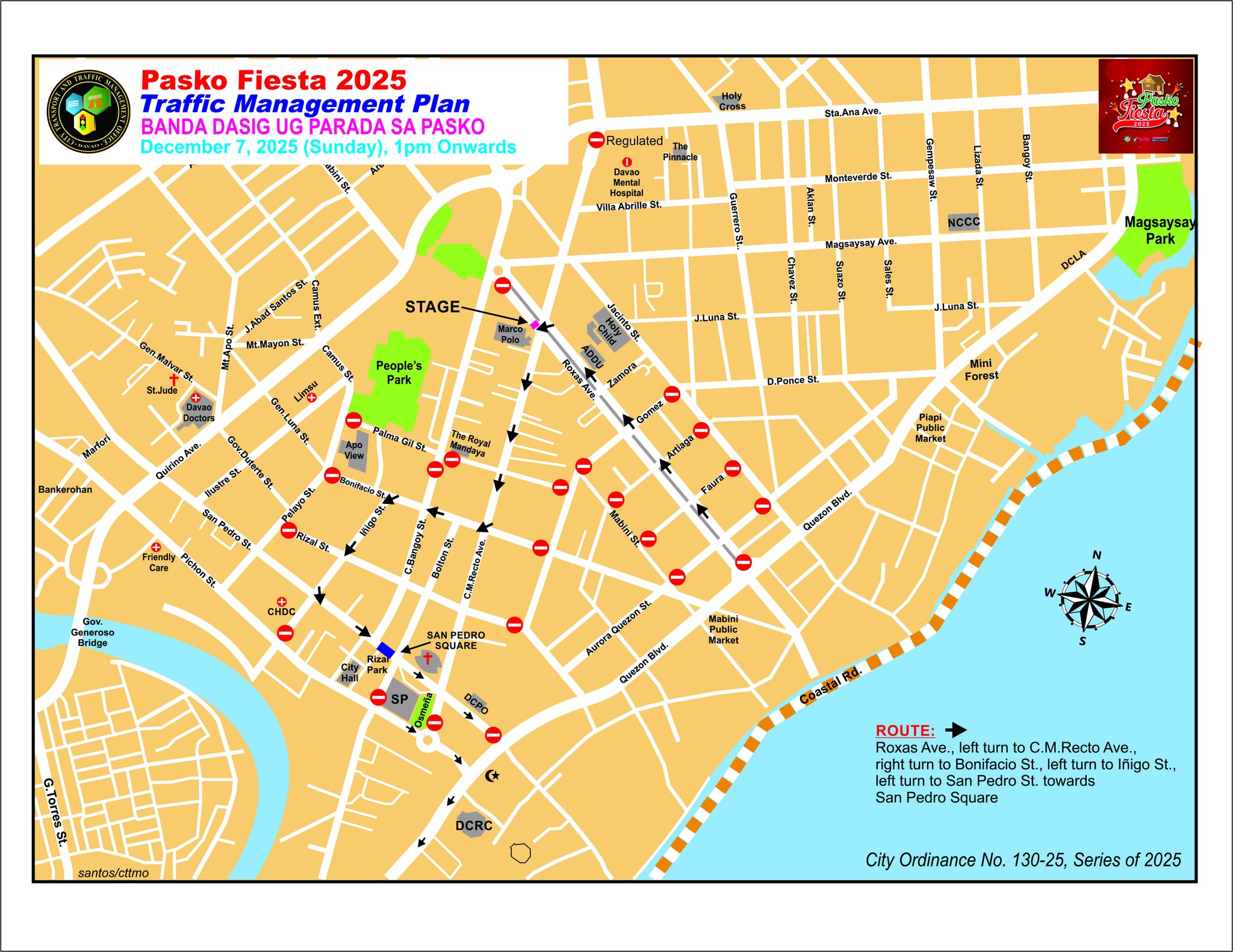 The parade route will be from Roxas Avenue, left turn to CM Recto Avenue, right turn to Bonifacio Street, left turn to Inigo Street, left turn to San Pedro Street, toward San Pedro Square.