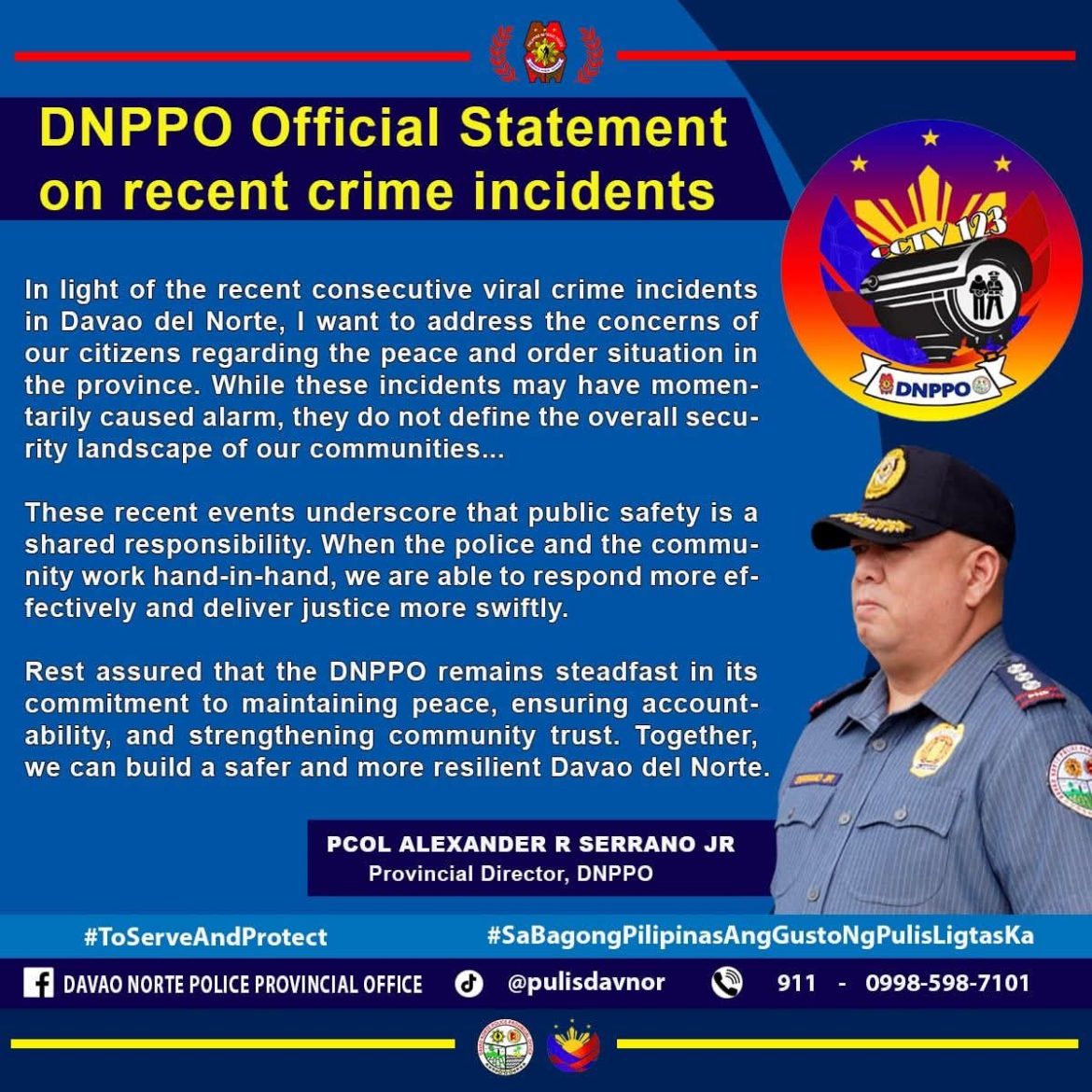 THE DAVAO del Norte Police Provincial Office (DNPPO) reassured residents that they are in control following a series of “viral crime incidents.”