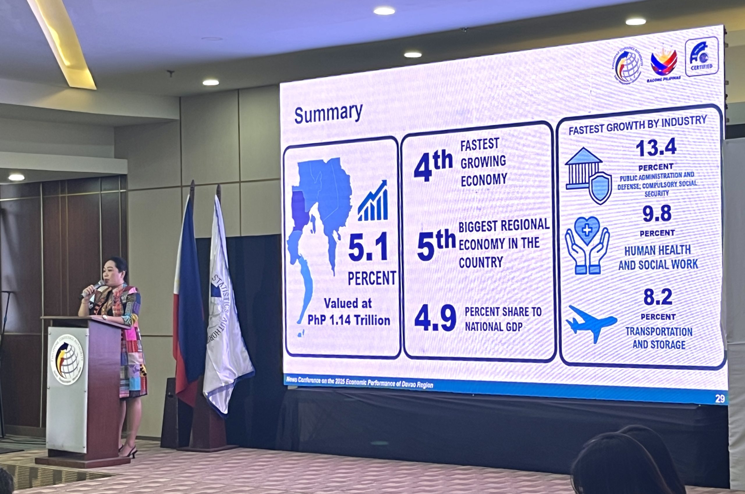 The region remained the fifth-largest economy in the country, accounting for 4.9% of the national gross domestic product, and ranked as the fourth fastest-growing among 18 regions, the Philippine Statistics Authority XI reported on Thursday, April 23, 2026.