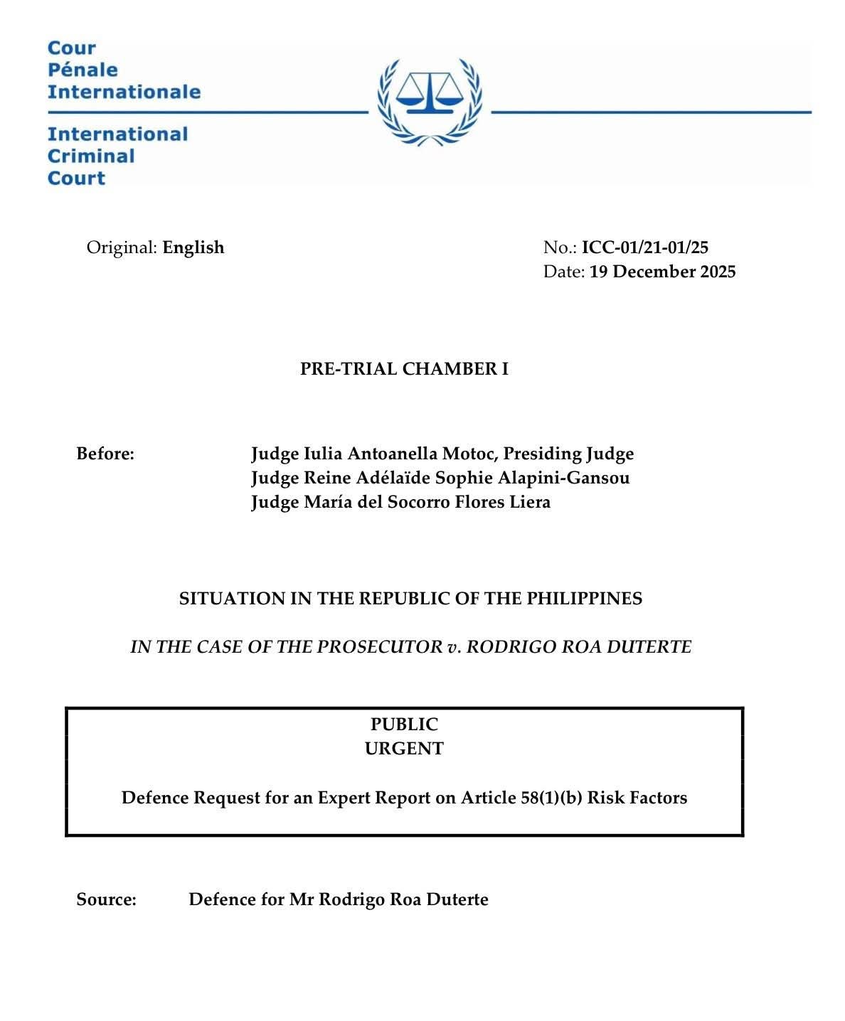 THE LEGAL counsel for former President Rodrigo Roa Duterte has filed an urgent request with the International Criminal Court (ICC) seeking an expert medical report, arguing that his deteriorating physical and mental health should disqualify him from continued detention.