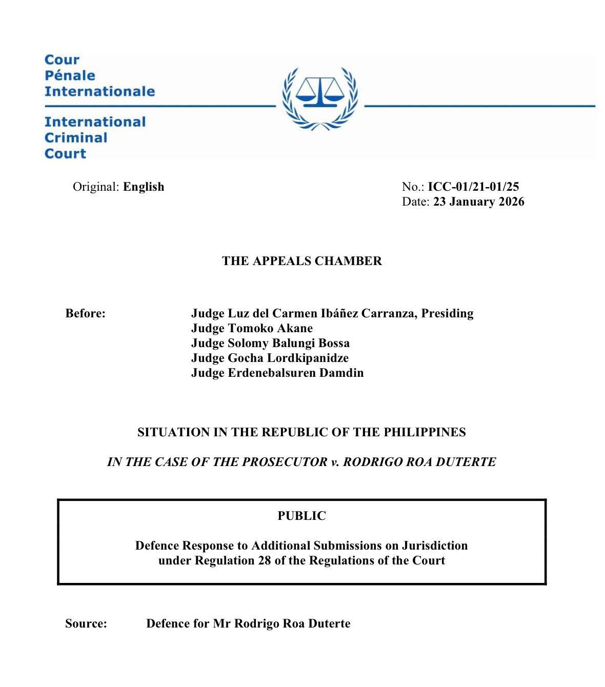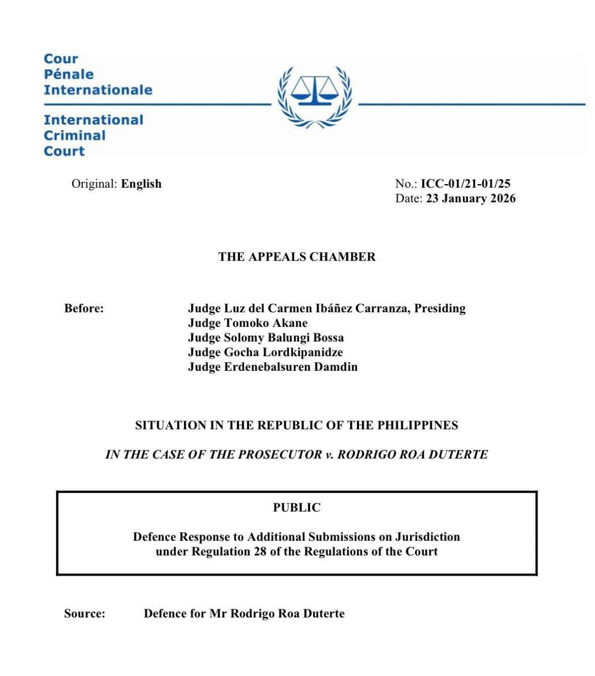 In a comprehensive filing submitted to the ICC Appeals Chamber on Jan. 23, 2026, the defense maintained that while the Court may have had theoretical jurisdiction over alleged crimes committed while the Philippines was a State Party, it lost the power to act on that authority once the country officially exited the Rome Statute.
