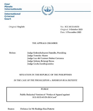 THE DEFENSE team for former President Rodrigo Roa Duterte has formally filed a Notice and Grounds of Appeal with the International Criminal Court (ICC), challenging the Pre-Trial Chamber’s decision to deny him interim release.