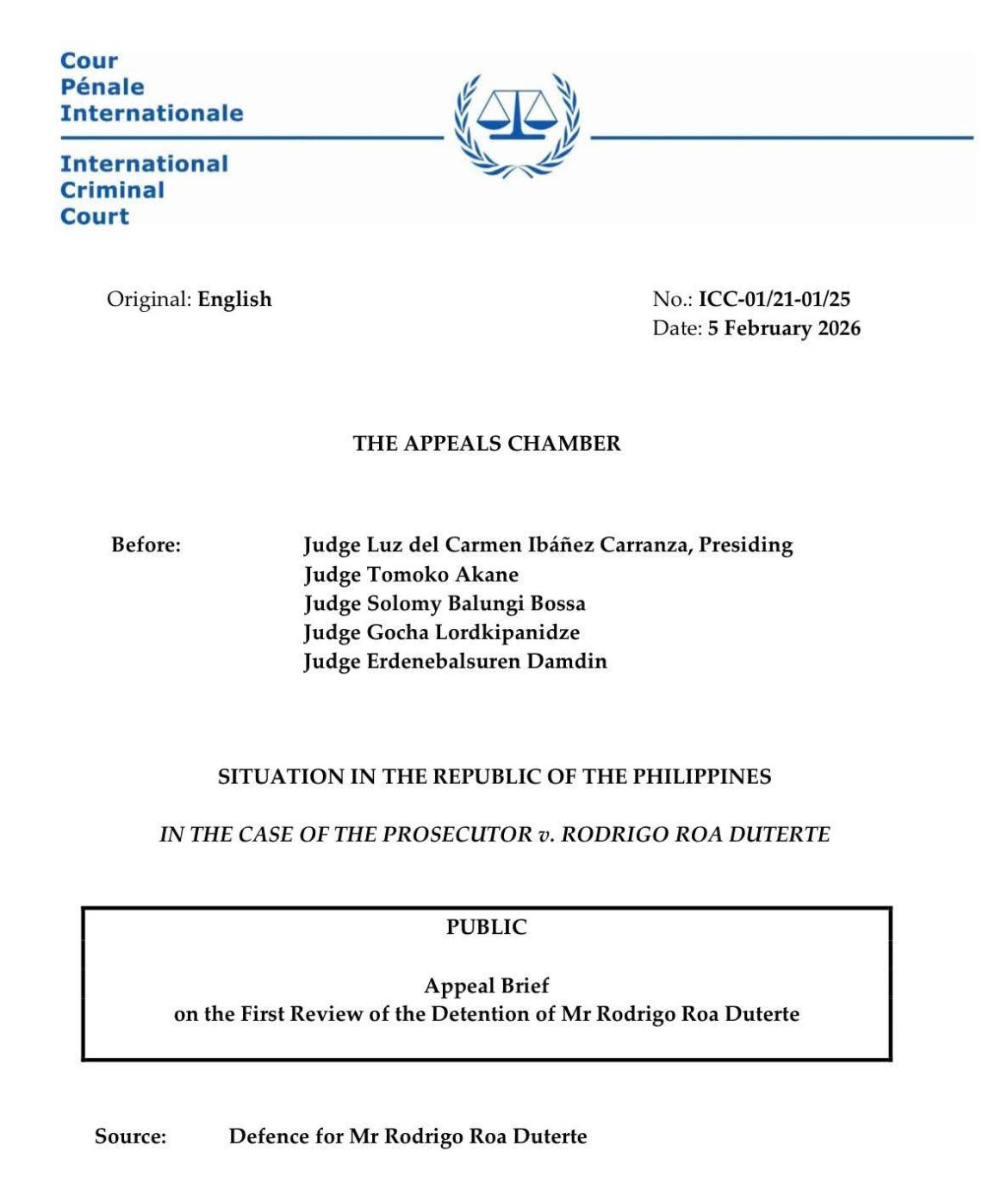 THE LEGAL team for former President Rodrigo Duterte has formally filed an appeal brief with the International Criminal Court (ICC) Appeals Chamber, demanding his immediate conditional release due to what they describe as deteriorating physical and neurological health.