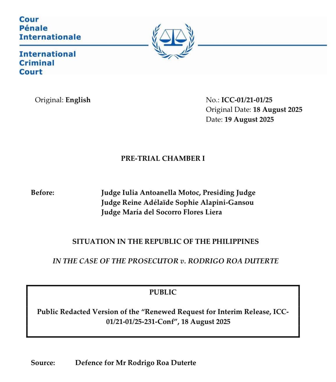 The filing, dated Aug. 19, 2025, from the Pre-Trial Chamber I, addressed the “Renewed Request for Interim Release” in the case of the Prosecutor vs. Rodrigo Roa Duterte.