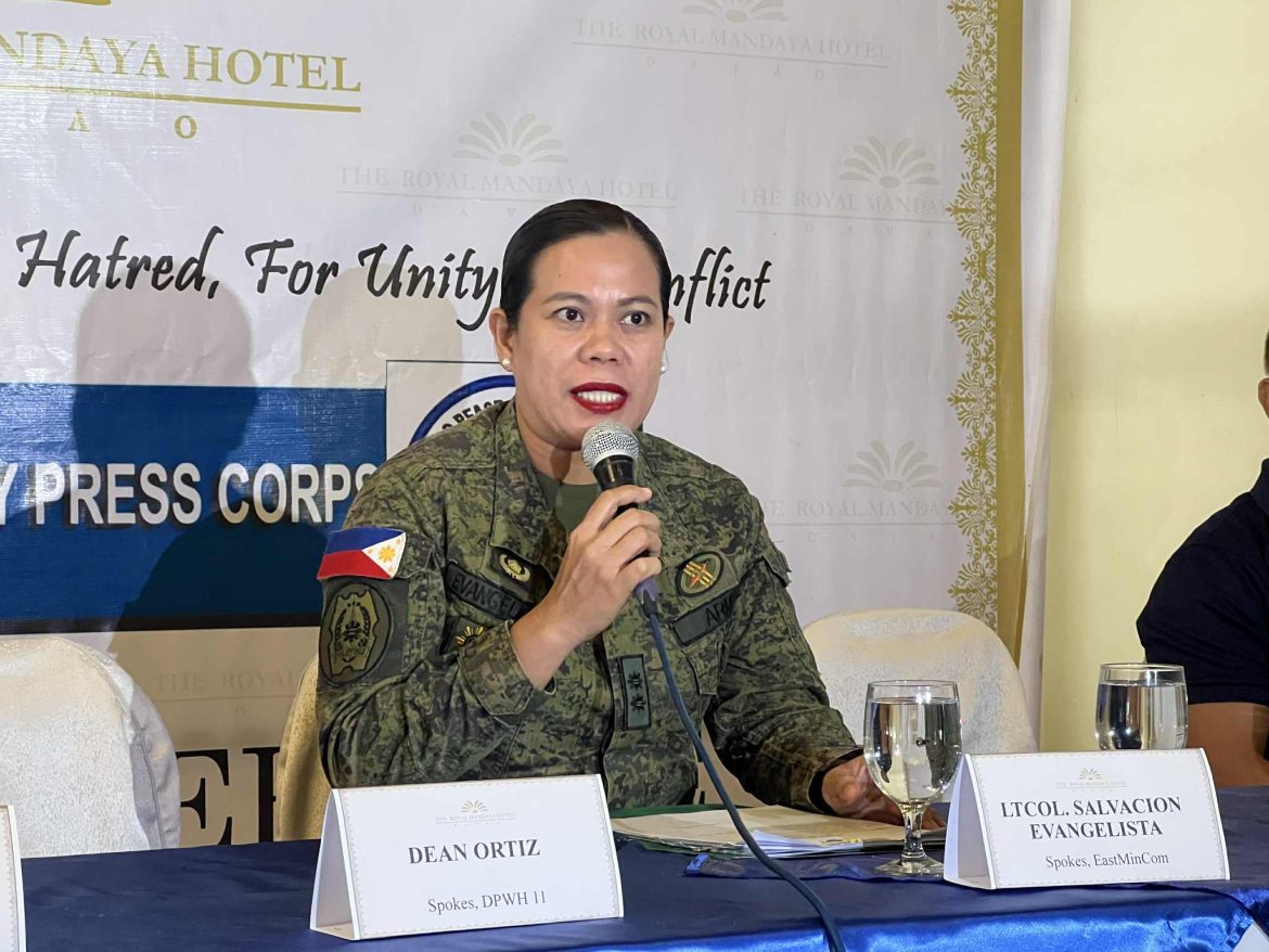 During a peace and security briefing held at The Royal Mandaya Hotel in Davao City on Aug. 6, Lt. Col. Salvacion Evangelista, spokesperson for EastMinCom, said while the declaration of insurgency-free status is underway, soldiers continue their campaign of eradicating communist presence in the communities.