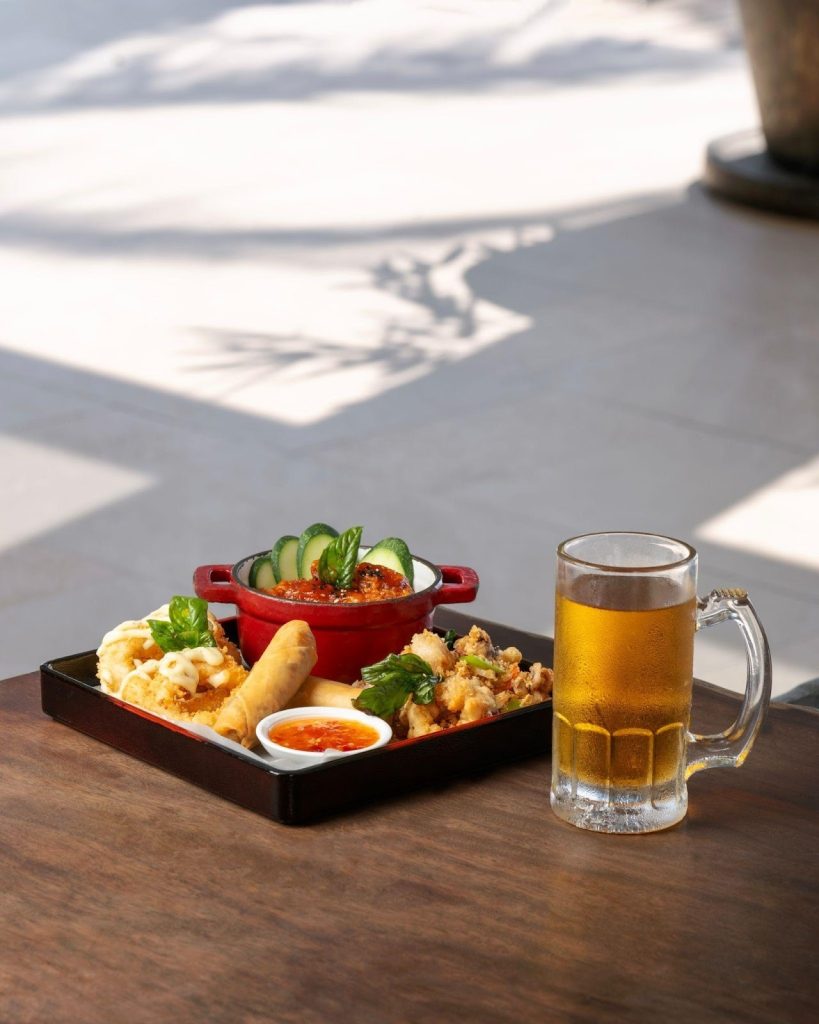 For crunch, go for baby squids and shrimp tempura with ginger soy. Lighter plates keep the same vibrant, island-fresh energy such as Davao green mango salad with bagoong and shrimp for a salty-sour punch, and Samal pomelo salad with shrimp, chili, and peanuts, refreshing, zesty, and deeply satisfying.