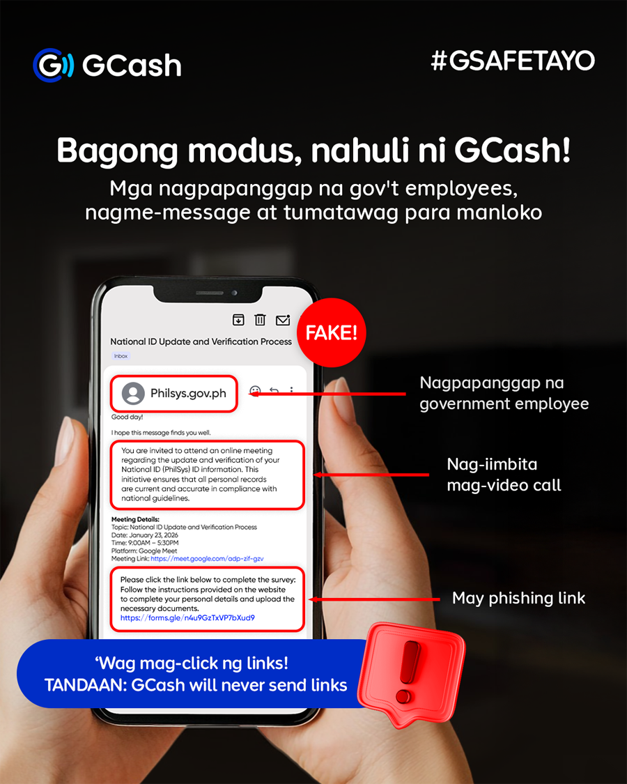 GCash warns users to beware of fake government IDs, suspicious video calls, screenshare requests, and bogus app downloads from unfamiliar websites.