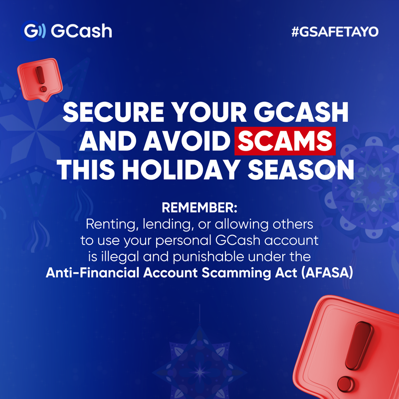 Further, GCash also reminds users that it will never ask for MPINs, OTPs, or personal details and will not send links via SMS, email, or chat apps. Sharing this information can give scammers access to accounts. Additionally, renting, lending, or allowing others to use your personal GCash account is illegal under RA 12010 Anti-Financial Account Scamming Act (AFASA), and may expose users to criminal liability, including involvement in money muling and other fraudulent activities.
