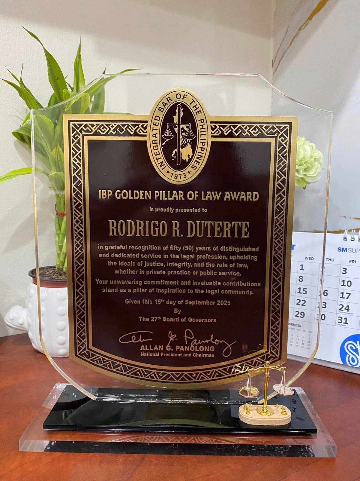 THE INTEGRATED Bar of the Philippines (IBP)-Davao City Chapter has issued an official statement defending its decision to confer the Golden Pillar of Law Award upon former President Rodrigo Roa Duterte, emphasizing that the recognition is based purely on objective professional qualifications and is not a political endorsement.