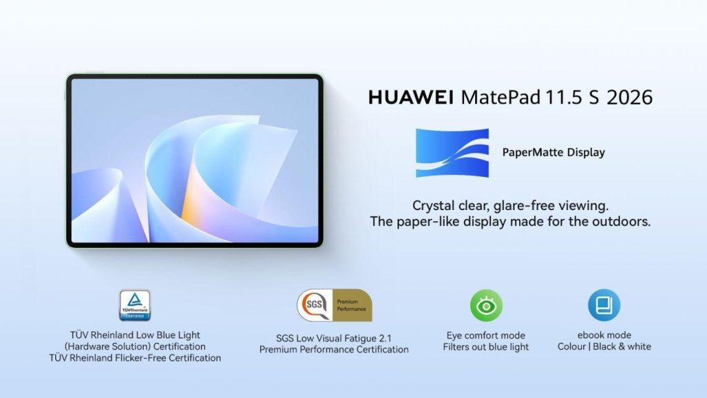 HUAWEI is the first brand in the industry to develop a PaperMatte Display tablet that eliminates distracting reflections and glare from traditional screens. Now a part of the HUAWEI MatePad 11.5 S’s innovations is the updated 3rd Gen Ultra-Clear PaperMatte Display, engineered to deliver visual comfort during extended screen time. Using high-precision nano-etched anti-glare technology, the display reduces sparkle by 50%, helping users stay focused. For users attending online classes, reviewing presentations, or working near windows and overhead lighting, content remains clear and readable without constantly adjusting angles or brightness.