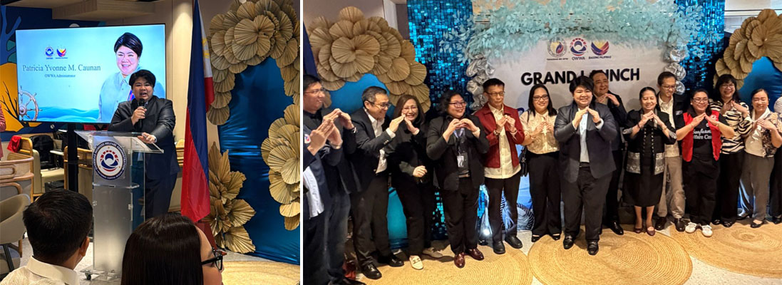 Serbisyong may puso (left photo). OWWA Administrator Patricia Yvonne “PY” Caunan welcomes seafarers and their families during the grand launch of Seafarers’ Welfare Center. Alagang OWWA (right photo). DMW Secretary Hans Leo J. Cacdac (5th from left) and OWWA Administrator Patricia Yvonne “PY” Caunan (7th) led the grand launch of the Seafarers’ Wellness Center that brings together legal, medical, and welfare services in one accessible hub for seafarers and their families.
