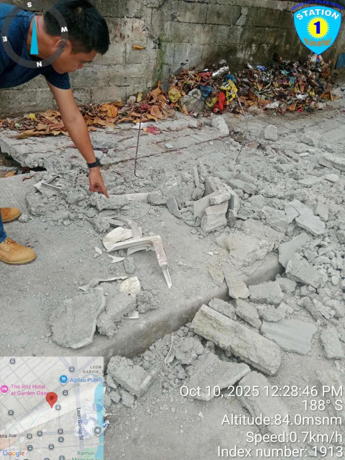 AN 80-YEAR-OLD man was crushed by a collapsing concrete wall while he was sitting on a monobloc chair along the sidewalk in Barangay Tomas Monteverde, Agdao District, following the Magnitude 7.4 earthquake that struck offshore of Manay, Davao Oriental at 9:43 a.m. on Friday, Oct. 10.