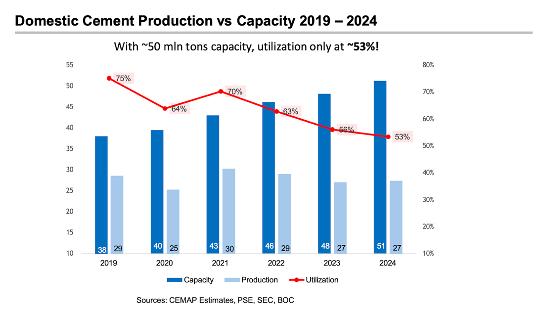 In 2024, cement imports reached 7.6 million metric tons, mostly from Vietnam. This happened even though the Philippine industry has a total capacity of 51 million tons. Demand was only around 35 million tons, and actual production dropped to 27 million tons. That means only 53 percent of the capacity was used. The result: Php 5 billion in losses, slower operations, and job cuts.