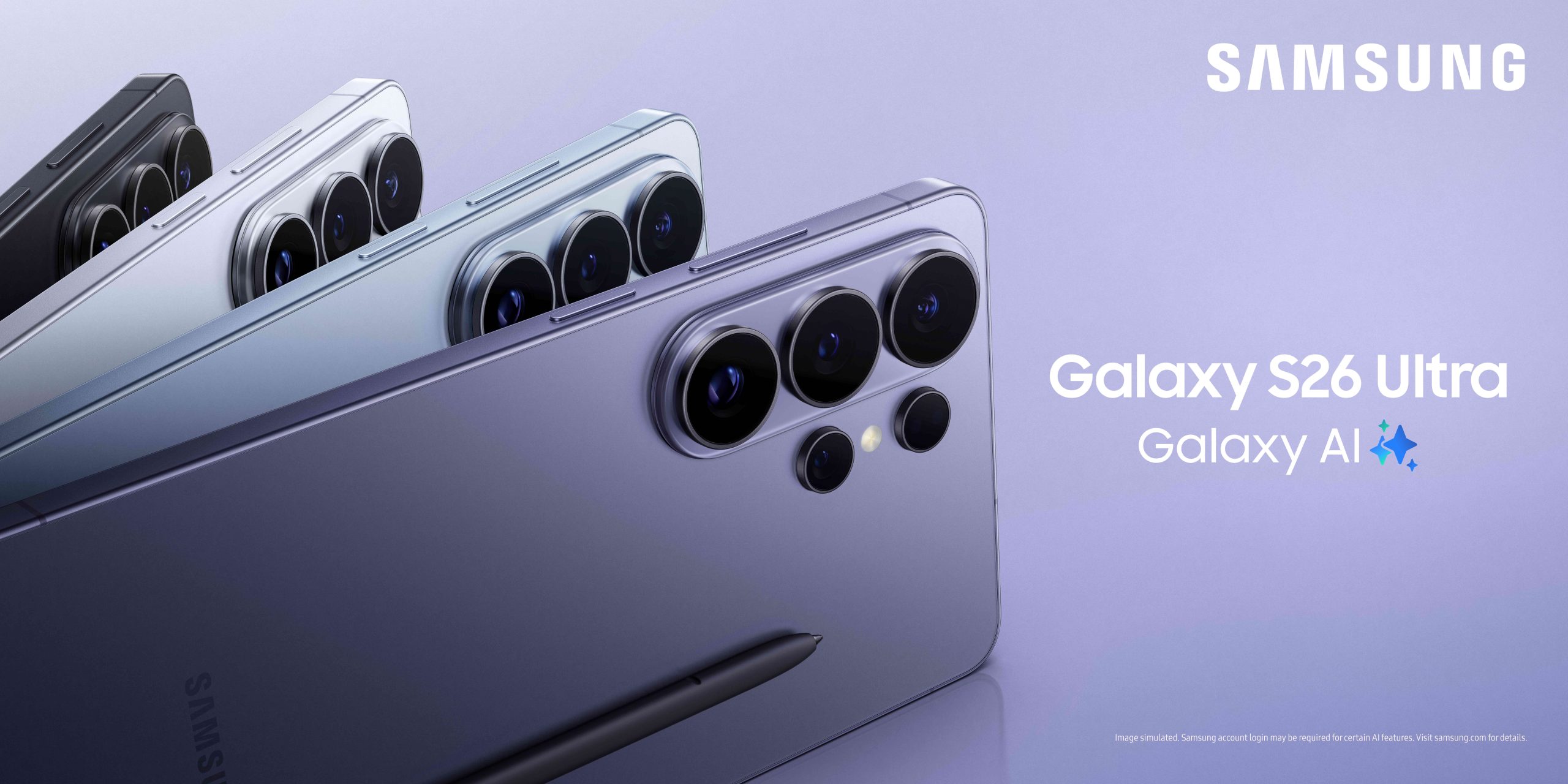 Galaxy S26 Ultra, S26+ and S26 will be available for pre-order starting from February 26. The Galaxy S26 series features a unified design language across all models, with shared color options including Cobalt Violet, White, Black and Sky Blue alongside the Samsung.com-exclusive Pink Gold and Silver Shadow.