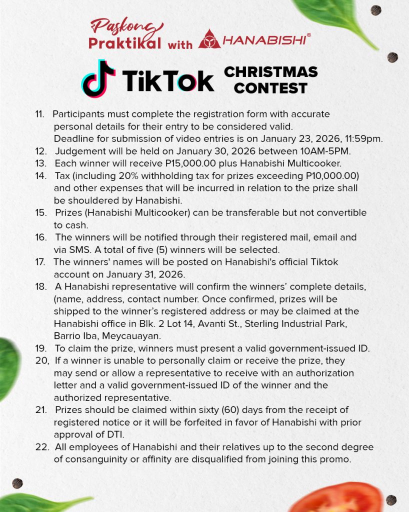 Include a caption explaining how the dish is “tipid but festive.” Use the hashtags #PaskongPraktikal and #MyHanabishi. Videos must be a maximum of 60 seconds and should clearly show the cooking or preparation process.