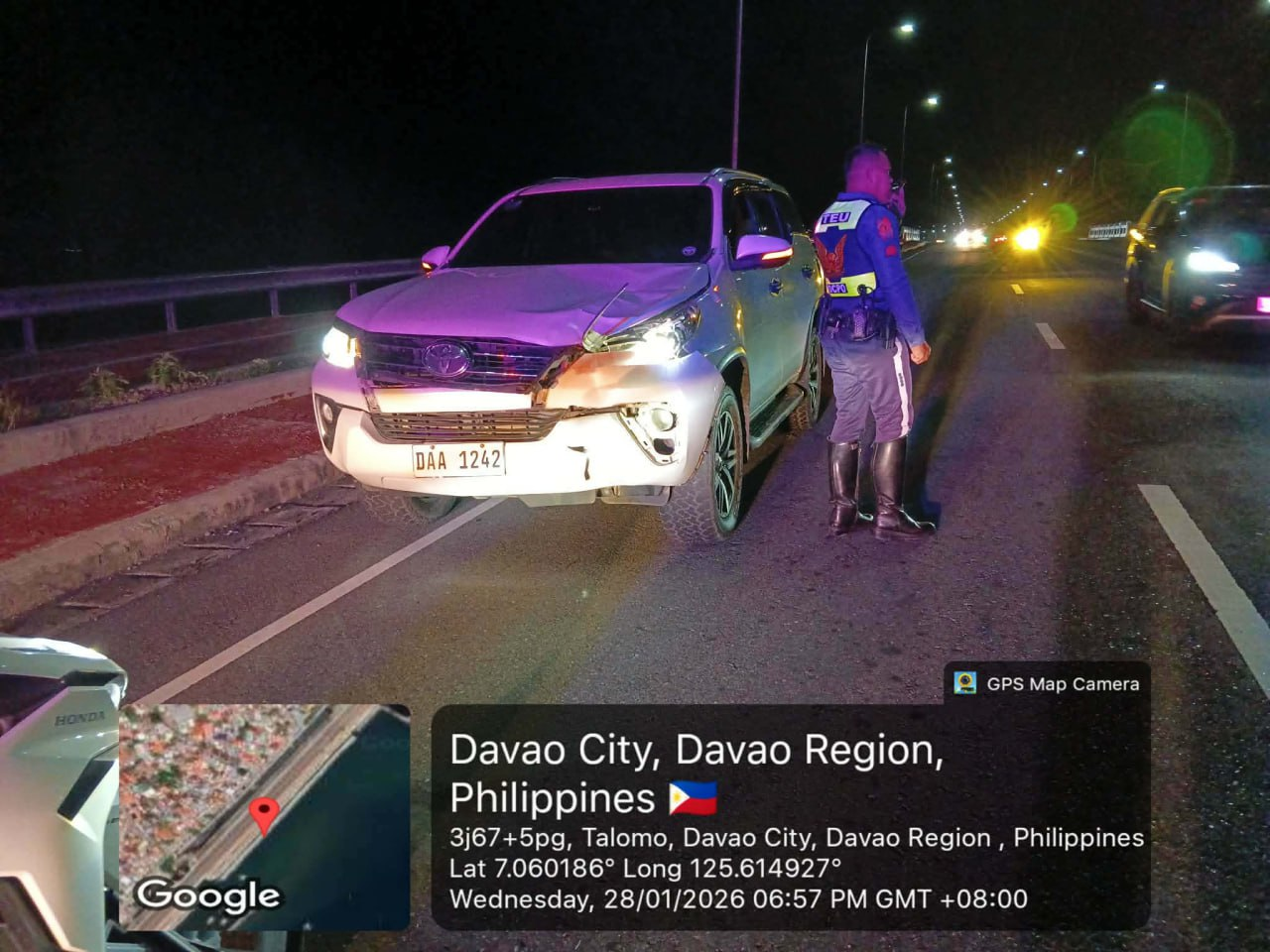 Simultaneously, a second Toyota Fortuner (V-2), driven by alias Niko, 36, a government employee from Barangay Ma-a, was heading in the opposite direction from Roxas Rotonda.