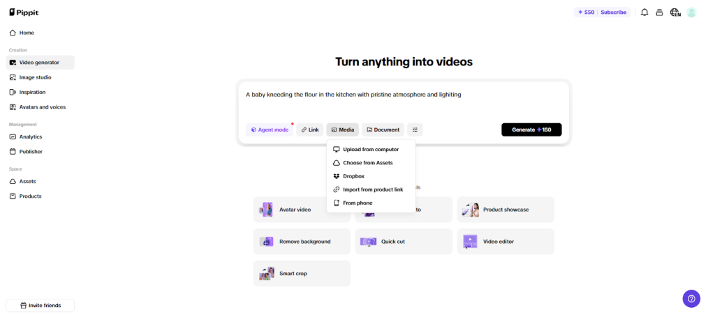 Log in to Pippit and head over to the “Video generator” tab. Enter your text prompt exactly how you want the video to appear. To make it precise, add reference media through the “Add media” tab. Choose files from your device, phone, Dropbox, or even link them. You can also select from assets. Once ready, press the “Generate” tab.