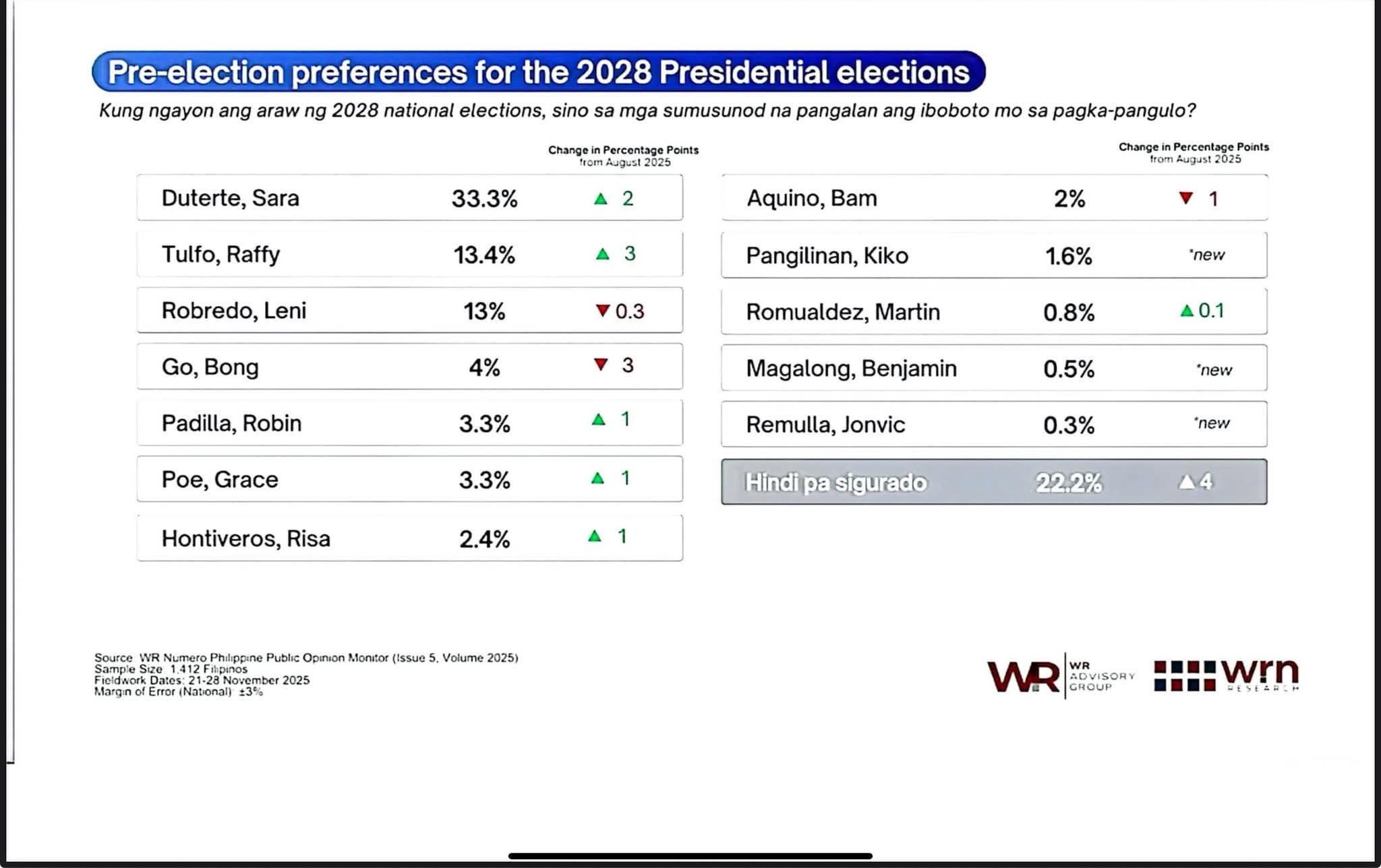 The results, based on the WR Numero Philippine Public Opinion Monitor (Issue 5, Volume 2025), which surveyed 1,412 Filipinos between November 21–28, 2025, showed VP Duterte garnering 33.3% of the national vote preference.