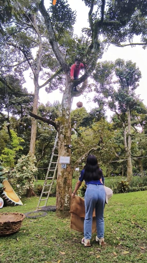 But the farm tour wasn’t all sitting and savoring. We also got a dose of adrenaline with a quick, hilarious, and surprisingly challenging try at durian catching. This fun simulation demonstrated the critical art of harvesting, especially for those highly prized export fruits. (For the record, the durians you find in local stands are often tree-dropped—the ones nature deemed perfectly ripe—giving them a unique, local flavor profile). Watching the pros handle the falling fruit with such casual skill made us appreciate just how much work goes into that creamy spoonful.