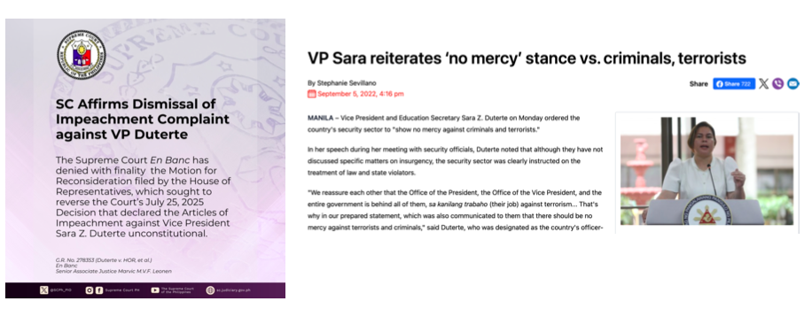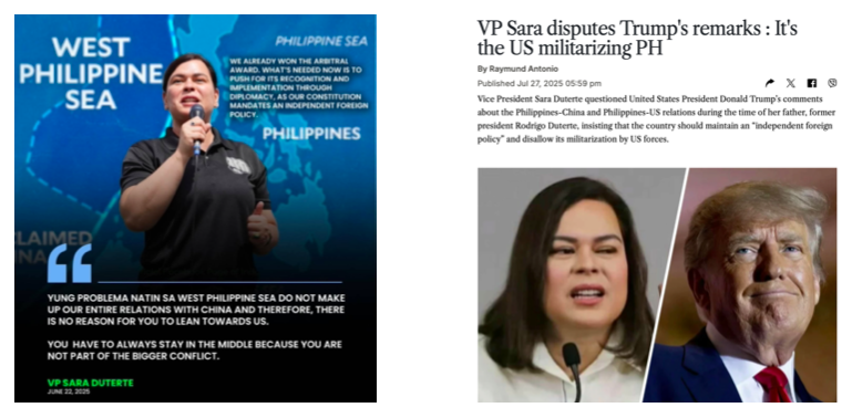 VP Sara had already addressed her silence on the West Philippine Sea dispute in August 2024, stating that she follows the Philippine Constitution, which provides for an independent foreign policy. She affirms that the “West Philippine Sea” is firmly anchored in UNCLOS (United Nations Convention on the Law of the Sea) and the 2016 arbitral award registered at the Permanent Court of Arbitration (PCA). In an interview in May 2025, VP Sara said she is “pro- Philippines.” In a separate interview with RT in June, she said that the Philippines should not take sides between the two superpowers, China and the United States. This provides context for her earlier statement that she is “not pro any country [superpower] at all.”
