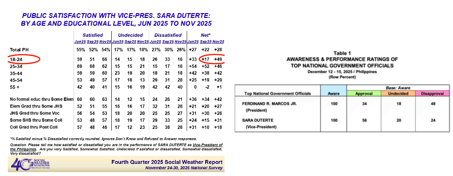 Among younger voters like me aged 18 to 24, Duterte’s support saw a significant increase. Her net satisfaction rose from +17% in September 2025 to +49% by the end of November, marking a +32-point gain.