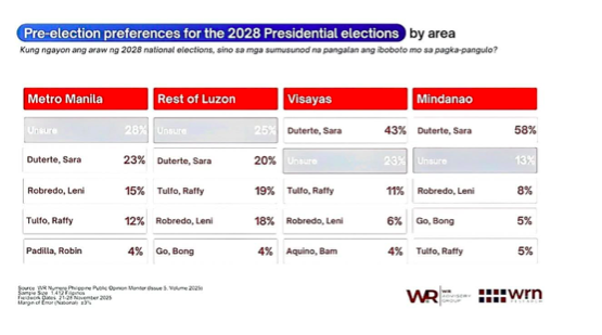 Duterte also leads early preferences for the 2028 presidential election, securing 33.3% support in the WR Numero Philippine Public Opinion Monitor (Issue 5, Volume 2025).