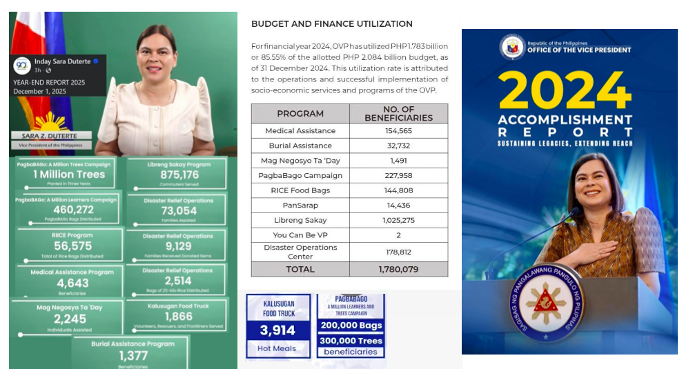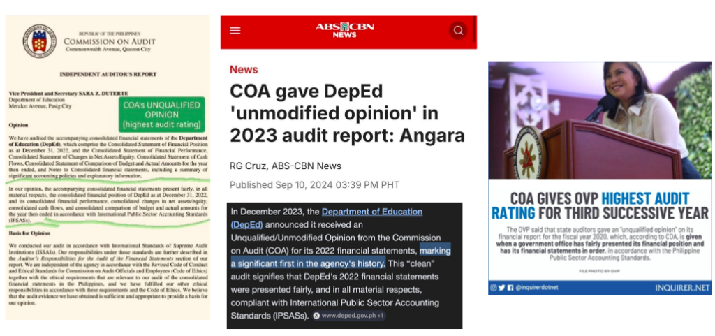 The OVP under Sara Duterte has received three consecutive unqualified (unmodified) opinions from the Commission on Audit (COA) in 2022, 2023, and 2024—the “highest audit rating” a government agency can receive. This continues the good governance example set when former Vice President Leni Robredo was still at the helm and received the same rating for four consecutive years.