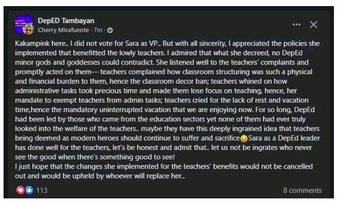 I will begin with a testimony from a Kakampink public school teacher, Cherry Milafuerte, who expressed gratitude to Sara Duterte for her achievements as Education Secretary.