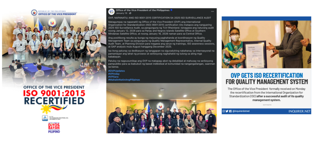 The OVP under VP Inday also passed the ISO 9001:2015 surveillance audit. An ISO 9001 certification means that an organization adheres to international standards for Quality Management Systems (QMS), ensuring consistent product/service quality and improved efficiency. The OVP was first certified for its QMS in 2017 under Leni Robredo.