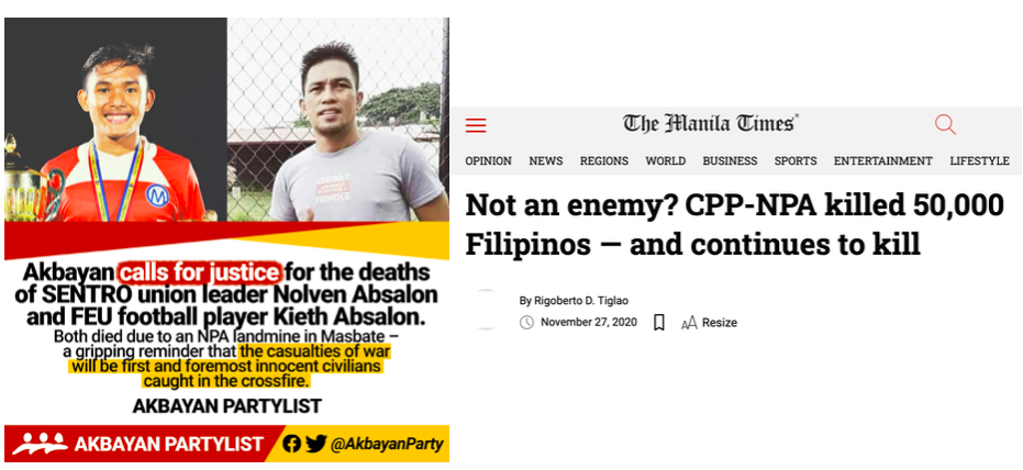 The CPP-NPA-NDF has been responsible for the deaths of approximately 50,000 Filipinos, including civilians, soldiers, and police officers, through bombings, the recruitment of students, the grooming of child warriors, the use of landmines, and the extortion of so-called revolutionary taxes from the poorest communities.