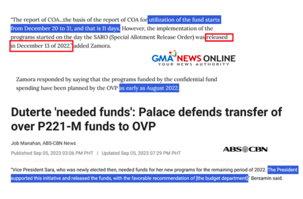 The Office of the President, with the endorsement of the Department of Budget and Management (DBM) authorized the transfer of confidential funds to the OVP at a later stage. Sara Duterte requested the funds in August 2022 for the safe, secure, and effective implementation of her office’s programs, including the establishment of OVP satellite offices. However, the OP only authorized the transfer on December 13, 2022.