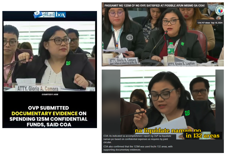 Atty. Gloria Camora, team leader of COA’s Intelligence and Confidential Funds Audit Office, testified under oath in multiple hearings that the OVP’s use of confidential funds was in line with applicable rules and that documentary evidence covering 132 locations was submitted in their liquidation report.