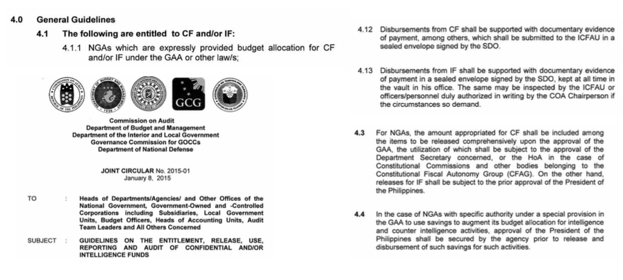 Confidential funds are termed “confidential” for a reason. Under COA Joint Circular No. 2015-01 (guidelines on the use of confidential and intelligence funds), the submission of standard receipts is not required, and the law does not prescribe a specific timeline for their utilization. There is no prohibition against their use within a short period.