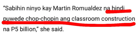 According to Sara Duterte, some congressmen asked if they could “chop-chop” portions of the ₱5 billion; she refused, as it would not help address classroom backlogs.